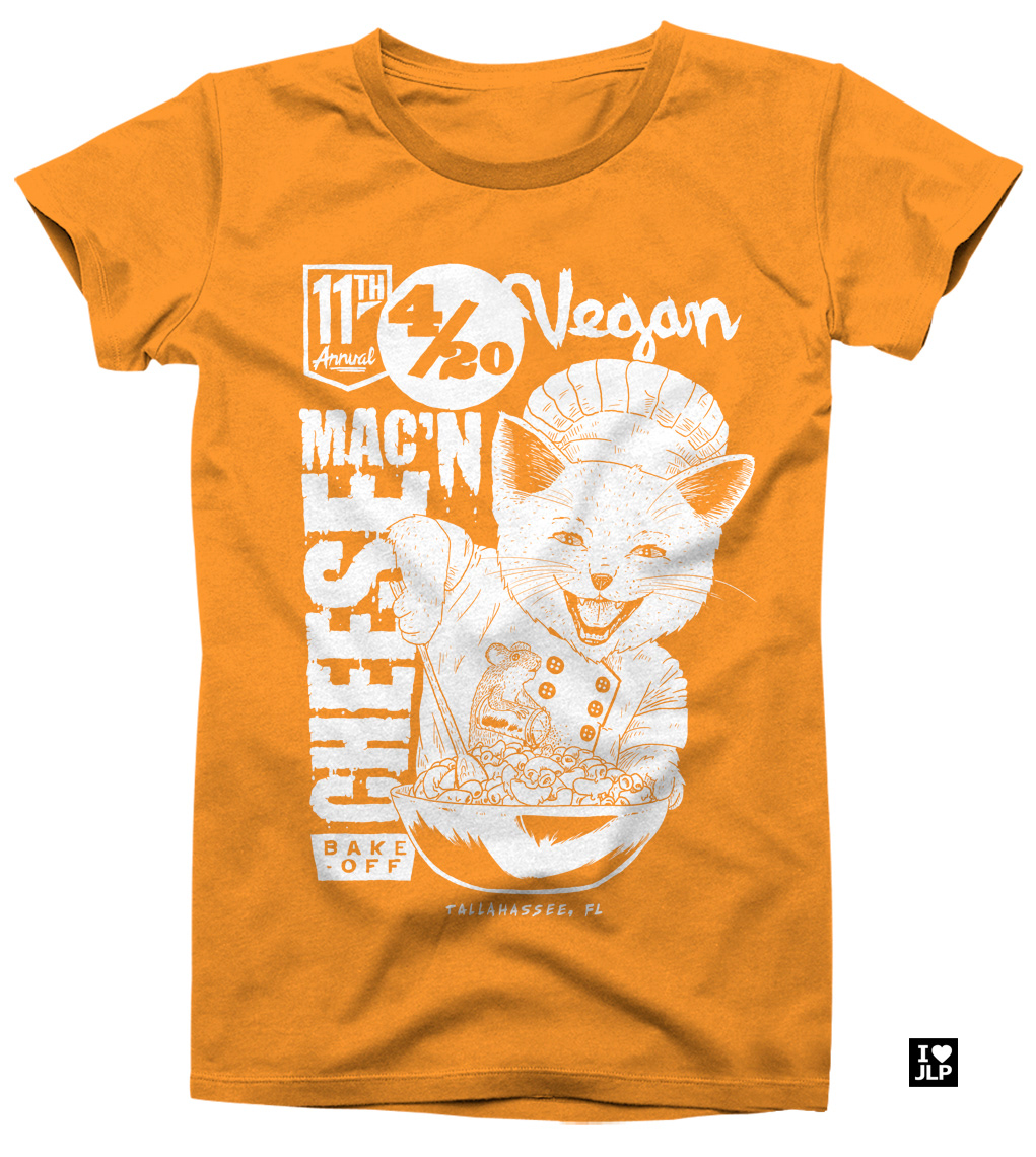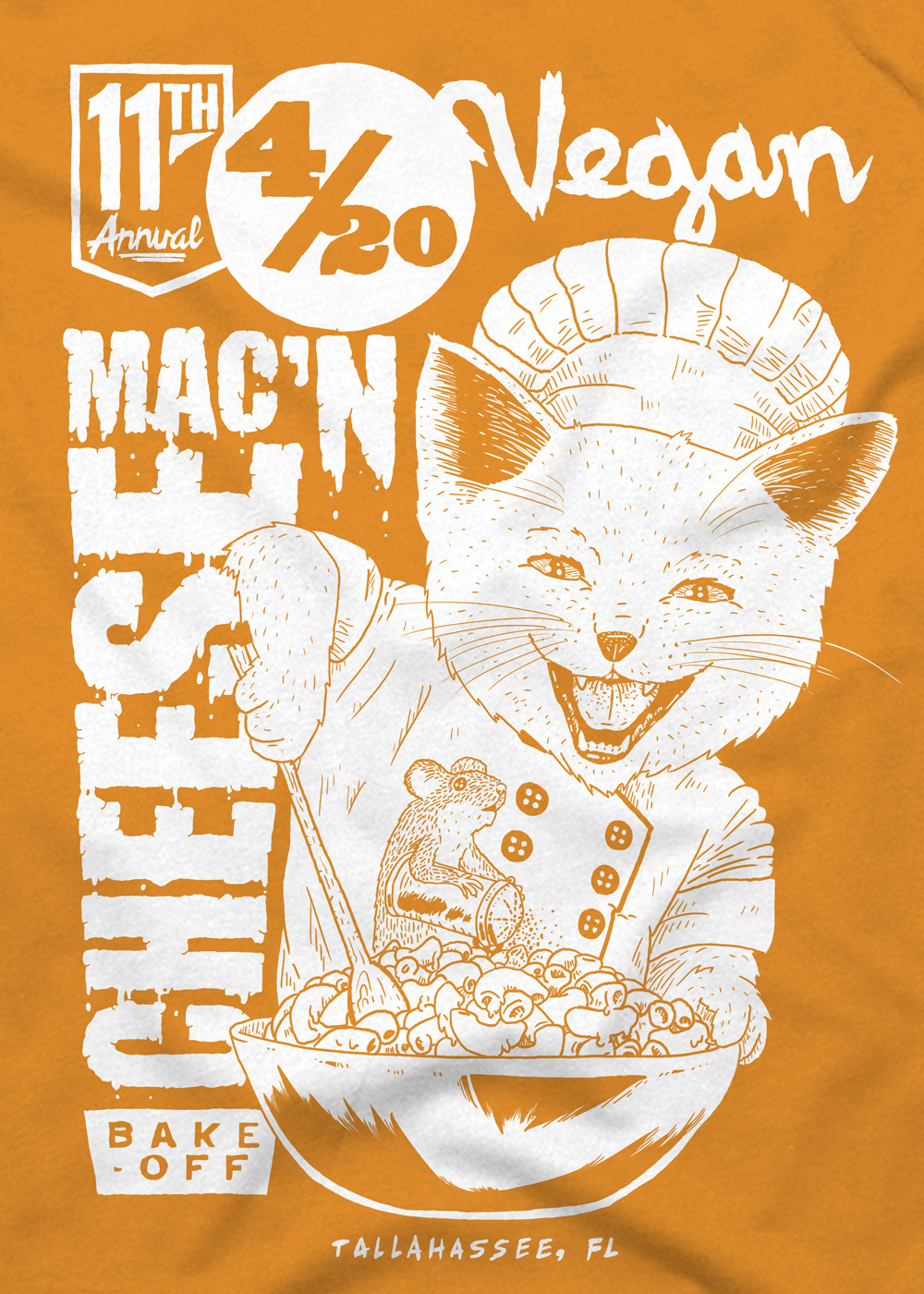 Shirt design and handbill for annual vegan mac ’n cheese cook off that happens in Tallahassee Florida every April 20th. Every year a new artist is asked to design everything for the event.