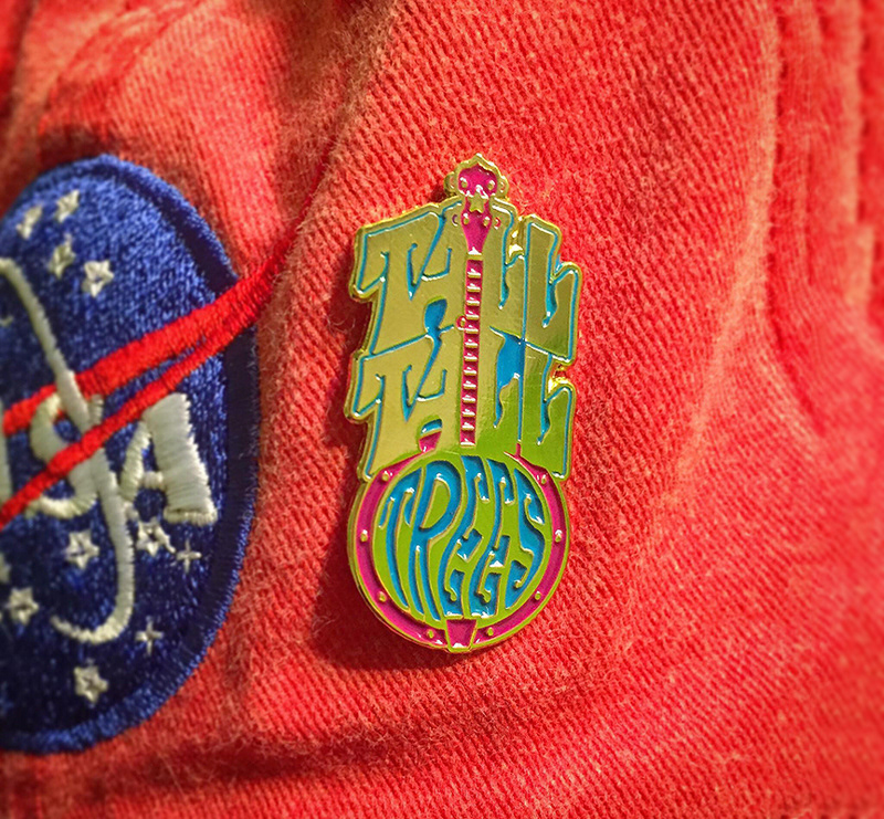 Enamel pin for Tall Tall Trees as a tour merch item.